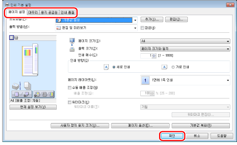 프린터 설정 화면에서 원하는 설정을 지정한 다음 → [확인]을 클릭합니다.