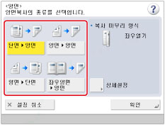 단면] 복사를 실행하기 위해 원고대에 양면 원고를 세트하려는 경우 [연속스캔]을 지정합니다. (See "연속 스캔.")[좌우양면