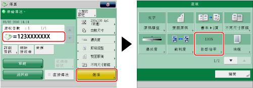 指定接收者→按[選項]→[影印倍率]。