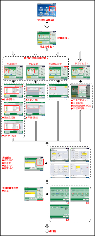 為了將掃描文件傳送至電子郵件位址、網際網路傳真位址或檔案伺服器,必須指定網路設定。(See "電子郵件/網際網路傳真一般通訊設定.")