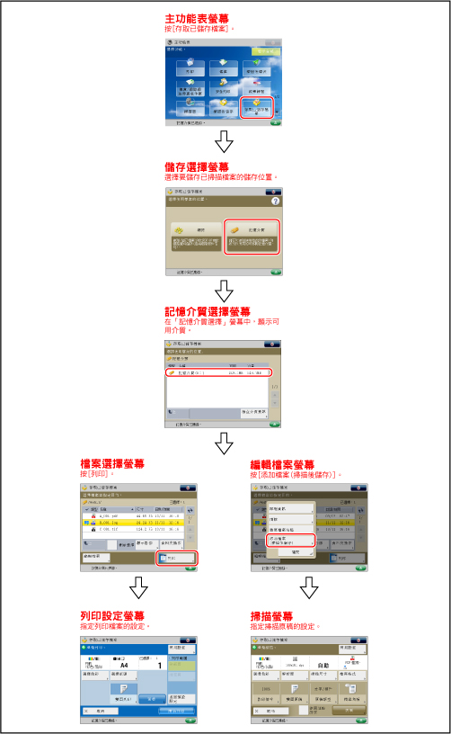 有關[添加檔案(掃描後儲存)]的操作和操作「掃描」螢幕的說明,請參閱"添加檔案(掃描後儲存)"和"掃描後儲存操作流程."