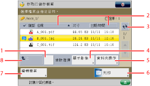 按下可以顯示用於添加檔案或顯示檔案的詳細資訊、刪除或重新命名所選檔案的功能表。