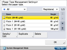 You can sort the paper type list by registration date ([Registered]), name ([Name]), or basis weight ([Weight]) from the Sort List drop-down list.