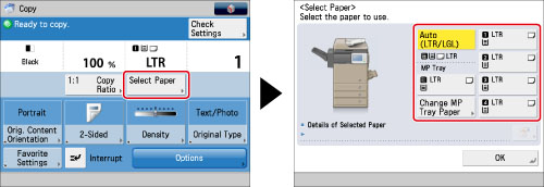 Icons indicating the type of paper loaded in each paper drawer can be displayed on paper selection screens, if you store that information into the machine beforehand. (See "Registering/Editing Custom Paper Types.")