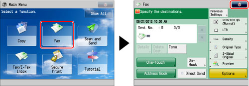 Four options shortcuts are displayed on the Fax Basic Features Screen. [Density], [Original Type], [2-Sided Original], and [Preview] are displayed as default. These shortcuts can be changed to functions that you frequently use.
