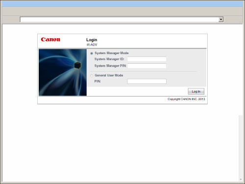 Select [System Manager Mode] and enter the System Manager ID/System Manager PIN, and then click [Log In] to log in to the Remote UI or a MEAP application (including login applications).