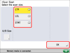 Since the machine does not have a function for automatically detecting the size of a placed original, the original size must be specified manually. However, the machine can distinguish between LTR and LGL originals that are loaded into the feeder when [Auto (LTR/LGL)] is selected.