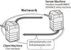 The machine can access a server machine on the network as a client machine to search for/specify destinations from the Address Book of the server machine.
