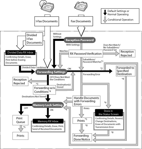 *2 If you set <Store/Print Received File> to 'On' in [Forwarding Settings], forwarded files are either printed or stored in the Memory RX Inbox. For more information on Store/Print Received File, see step 15 of