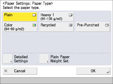 You can register paper types if paper types for the loaded paper are not displayed on the detailed setting list. For instructions on registering paper types, see "Registering/Editing Custom Paper Types."