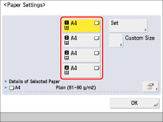 If [Custom] is displayed as the paper size when you load standard sized paper, press [Custom Size] → [Cancel Set.]. The proper paper size will be detected automatically and displayed on the screen.