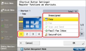Press the shortcut button you want to display → select the function to register in the shortcut button. If you do not want to select a function, press [Unassigned].