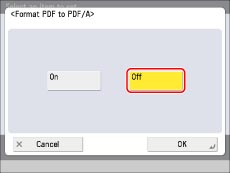 Follow the procedure below to confirm that [Format PDF to PDF/A] is set to 'Off'.