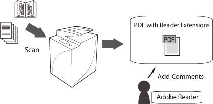 If you select the Reader Extensions mode when converting a paper document to a PDF file, you can add/edit comments, and add signatures using Adobe Reader (Adobe Reader 7 or later).