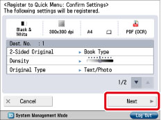 If you select [On], when the registered button is recalled, a screen confirming the settings is displayed. For more information on the confirmation screen, see " Sending a Document Using the Quick Menu Button." If you select [Off], when the registered button is recalled, a screen confirming the settings is not displayed.