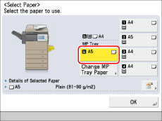 If paper is being fed from the multi-purpose tray for the current job, you can select the paper for the next job from [Change MP Tray Paper]. (See "Reserving a Copy Job Using the Multi-Purpose Tray.")