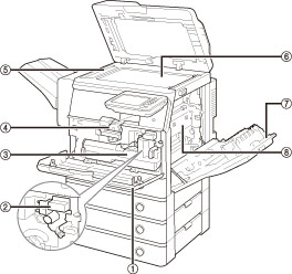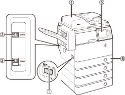 Flashes or lights if there is an error in the machine. When the Error indicator flashes, follow the instructions that appear on the touch panel display. When the Error indicator maintains a steady red light, contact your local authorized Canon dealer. |