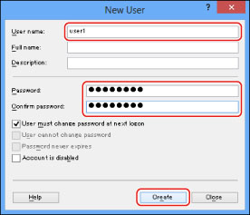 In the [New User] dialog box, enter the user name in [User name] → enter the password in [Password] → re-enter the password in [Confirm Password] → click [Create].