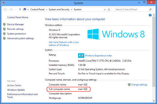 Click the [Computer Name] tab → confirm [Full computer name] → click [Cancel].