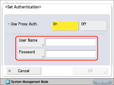 If authentication is required when accessing an external network through a proxy server, enter the user name and password registered on the server.