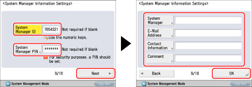 The default setting for both the System Manager ID and System Manager PIN is '7654321'. After installing the machine, when logging in for the first time, enter '7654321' for both the System Manager ID and System Manager PIN.