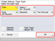 If the paper type of the paper that you have loaded is not listed in the detailed setting screen, you can register it in the paper type list. For details on registering paper types, see "Registering/Editing Custom Paper Types."