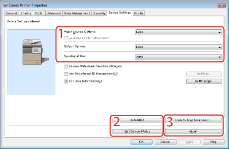 You can obtain device information and update the settings displayed in the sheet (see "Setting the Printer Options").