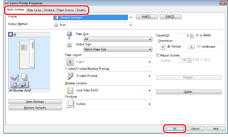 The default setting for [1-sided/2-sided/Booklet Printing] in the [Basic Settings] tab is [2-sided printing]. For details, see "1-sided and 2-sided Printing."