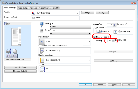 There are two methods for scaling a document: select the output size of the document to scale it automatically, or specify the scaling value manually.