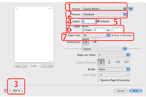 ] to the right of [Printer].If the above functions cannot be set in the upper part of the [Print] dialog box, display and set them in the [Copies & Pages] preferences pane or the [Page Setup] dialog box.