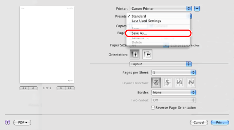 You can save print settings that you specified in each preferences pane of the [Print] dialog box to use as a preset. A preset is a combination of settings that you use frequently, saved as a single setting. If you select a preset when printing a file, the file will be printed with the saved settings.