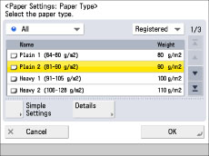 Paper sizes and types can also be registered from the Consumable screen.(See "Checking the Status of Consumables and Other Information.")