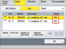 If the document was received successfully, [OK] will be displayed, if it failed to send, [NG] will be displayed, and if the results cannot be confirmed, [--] will be displayed.