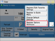 You can create shortcuts to frequently used functions in [Options]. You can also create shortcuts to [Favorite Settings]. For information on favorite settings, see
