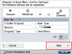 If you select [Device Login Auth. Info.] for [Info. Used for File TX/Browsing Auth.] in [Function Settings] (Settings/Registration), a password for a file destination is not stored in a personal button or a shared button in the Quick Menu. For more information on settings for [Info. Used for File TX/Browsing Auth.], see "Specifying Authentication Method for File Server."