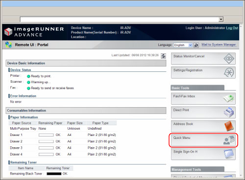 Only the System Manager, or SSO-H System Administrator (Administrator)/Network Administrator (NetworkAdmin)/Device Administrator (DeviceAdmin) can operate the Quick Menu Page. For information on the types of administrators, see "Administrator Settings."