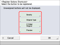 Four options shortcuts are displayed on the Fax Basic Features Screen. [Density], [Original Type], [2-Sided Original], and [Preview] are displayed as default. These shortcuts can be changed to functions that you frequently use.