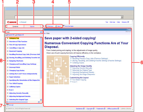 The explanatory pages under each category in the e-Manual are called "topics." They appear in a screen similar to the one below.