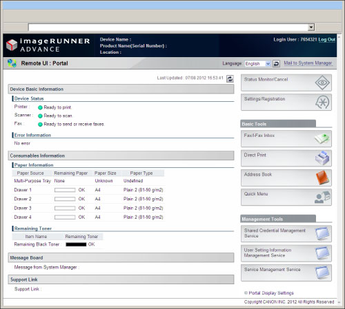 Once this is achieved, start your web browser and enter the machine's IP address. The Remote UI screen appears on your computer screen and is ready for use.