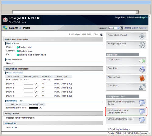 To specify each setting for User Setting Information Management Service, it is necessary to access and then log in to the machine from the Web browser. This section describes the procedure for accessing the machine from the portal page of the Remote UI.