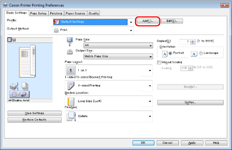 To edit or delete a profile, in the printer driver screen, click [Edit] at the right of [Profile]. However, pre-defined profiles cannot be modified.