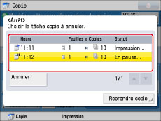 Si l'on appuie sur [Annuler] dans l'écran qui apparaît pendant la copie ou en mode d'attente, il est possible d'annuler la tâche en cours de copie, ou la dernière tâche pour laquelle un original a été lu et qui est en attente de copie.