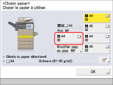 Si le papier chargé dans le plateau multifonctions n'est pas celui à spécifier, retirer toutes les feuilles puis charger le papier à spécifier dans le plateau multifonctions. (Voir "Chargement du papier dans le plateau multifonctions".)