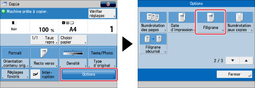 Le texte saisi dans [Personnalisé] n'est pas enregistré automatiquement. Pour sauvegarder le texte à sélectionner avec les filigranes sécurisés afin de les réutiliser ultérieurement si nécessaire, appuyer sur [Mémoriser] → saisir le texte à mémoriser.