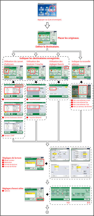 Pour qu'il soit possible d'envoyer des documents lus vers une adresse e-mail ou I-Fax ou un serveur de fichiers, les réglages réseau doivent avoir été paramétrés. (Voir "Réglages de communication communs pour les e-mails/I-Fax".)