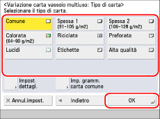 È possibile registrare tipi di carta diversi da quelli elencati in Impostazioni dettagliate per la selezione del tipo di carta. Per informazioni sulla registrazione di un tipo di carta personalizzato, vedere "Registrazione/modifica dei tipi di carta personalizzati".