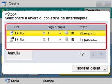 Premendo [Annulla] sulla schermata che viene visualizzata durante la copia o l'attesa di copiatura, è possibile annullare il lavoro in fase di copiatura o l'ultimo lavoro in attesa di copiatura per il quale è stato acquisito un originale.