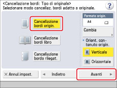 Premere [Cancellazione bordi origin.] → selezionare l'orientamento dell'originale → premere [Avanti].