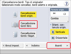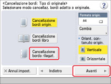 Premere [Cancellazione bordi libro] → selezionare l'orientamento dell'originale → premere [Avanti].