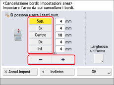 Selezionare [Centro] e [Lati] → premere [-] o [+] per impostare le rispettive ampiezze del bordo da cancellare.